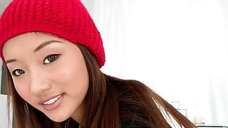Slutty Asian cutie gargles off two fellows during a wild threeway